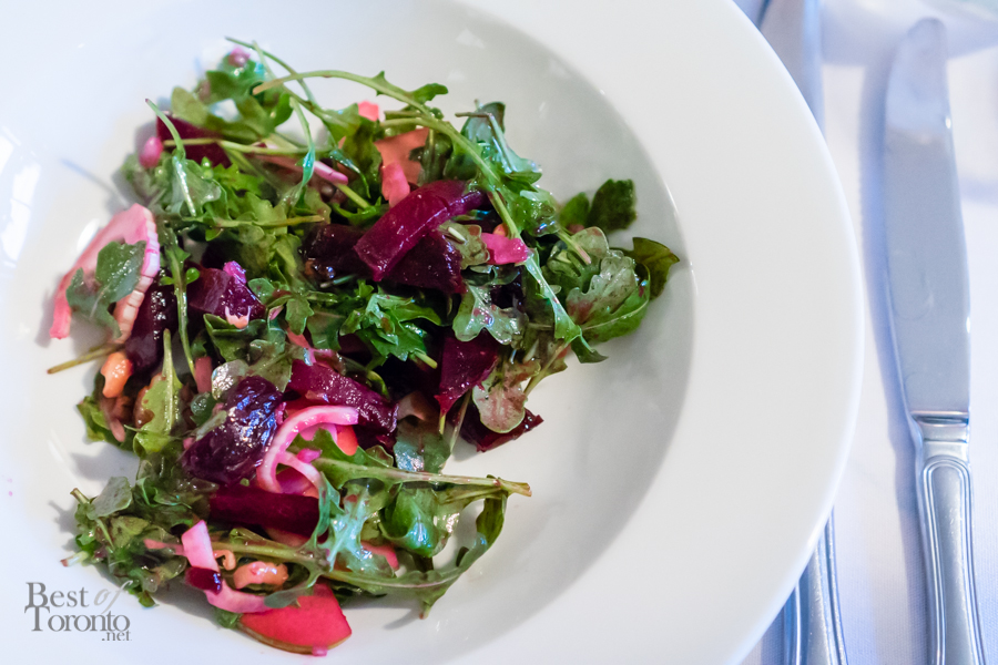 The other two groups were just as busy and surely learning just as much we were. One group was making a beet, fennel, and apple salad with honey mustard dressing. The other group was making the sides for the steak, which included glazed beans and truffle roasted fingerling potatoes. Once all groups were finished, we were led to the private dining room where we would enjoy the fruits of our labour.