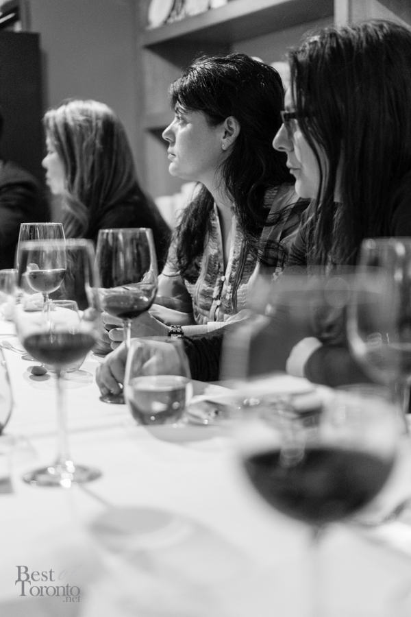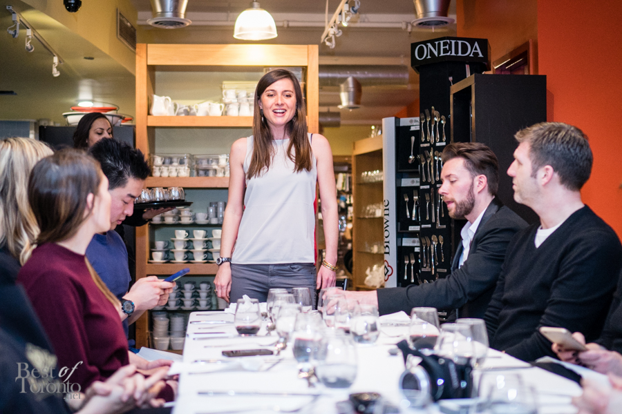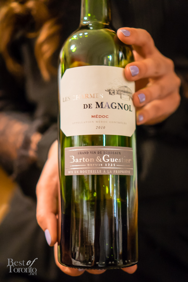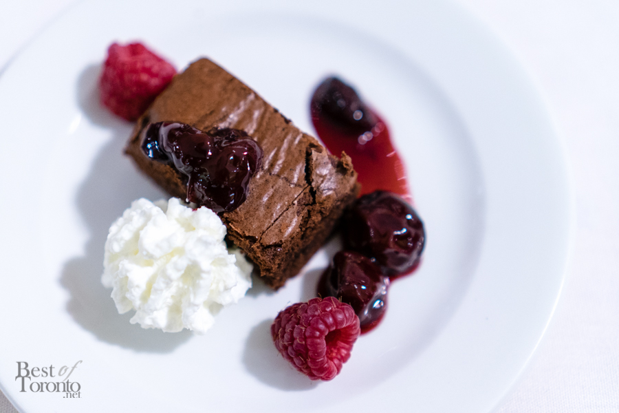 In between courses, Quereux mingled with the guests and gave a brief description of each of the wines. The guests engaged in enjoyable conversation and were having a good time. The two dishes we had so far were already great, and then the dessert arrived – a dark chocolate brownie with sour cherry compote. With it came a glass of the recently released Les Charmes de Magnol Médoc ($18.95 at LCBO). I don’t normally like dry wines, but this one beautifully complemented the sweetness of the brownie and the tartness of the compote. It was a great way to end the evening.