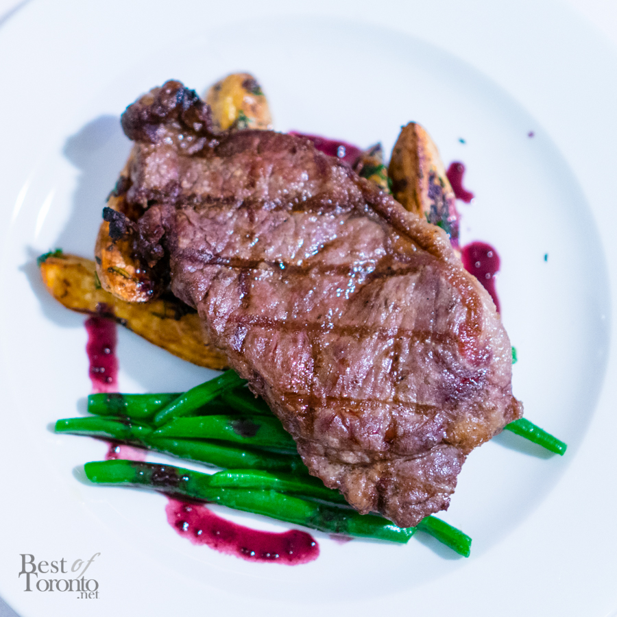 - NY Stripling with Cabernet Sauvignon jus on a bed of glazed beans and truffled fingerling potatoes