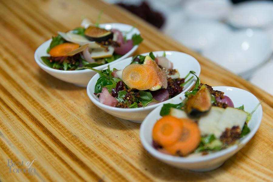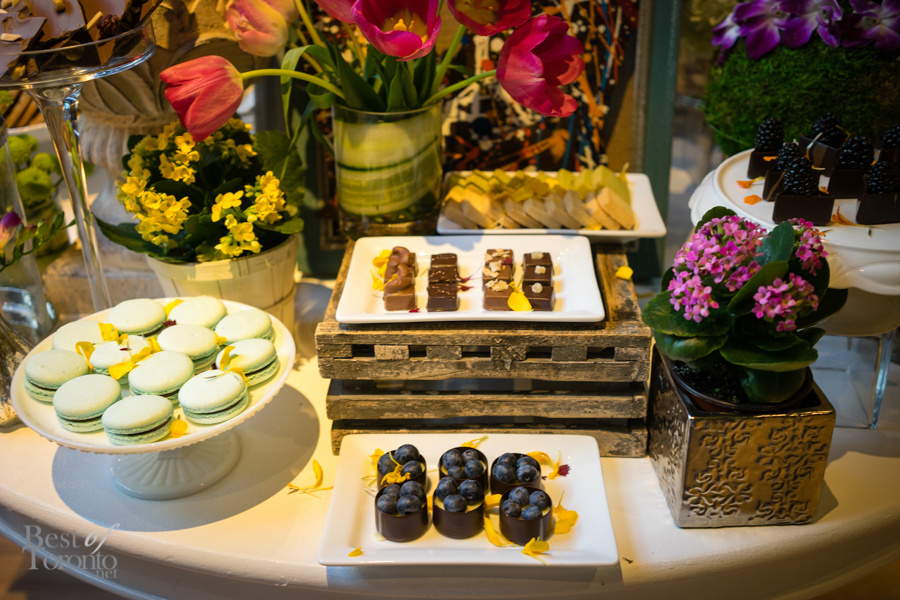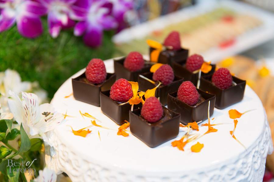As for food, Aperture Room is headed by O&B’s corporate event chef Jamie Meireles. The menu is extensive, with options suitable for different events from express corporate lunches to formal seated dinners. Today, we had a sampling of some of these items, including canapés such steak tartare on a potato chip, and smoked duck. At the two food stations, they served a shaved pear, spinach, and fennel salad, and a citrus cured albacore tuna. Craft cocktails made with prosecco, elderflower, and edible flowers, as well as O&B’s house white and red wines were available to drink. For sweets, there was an impressive dessert table complete with macarons, tarts, cookies, chocolates, and other items to satisfy your sweet tooth.