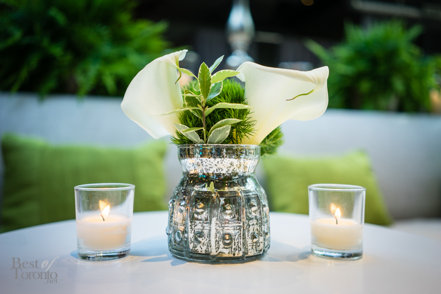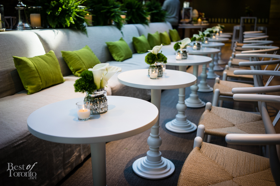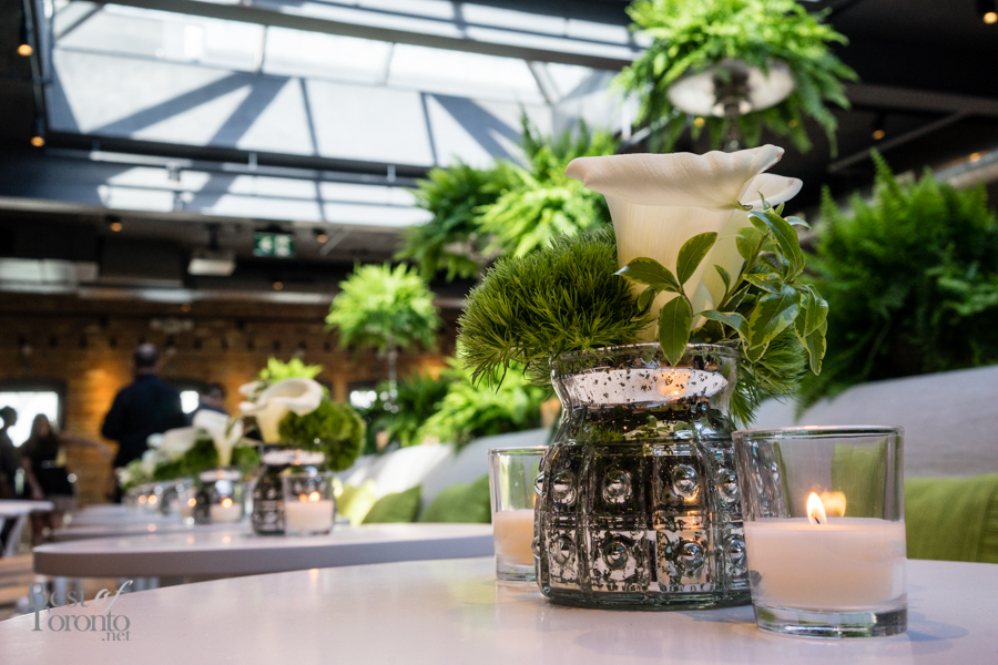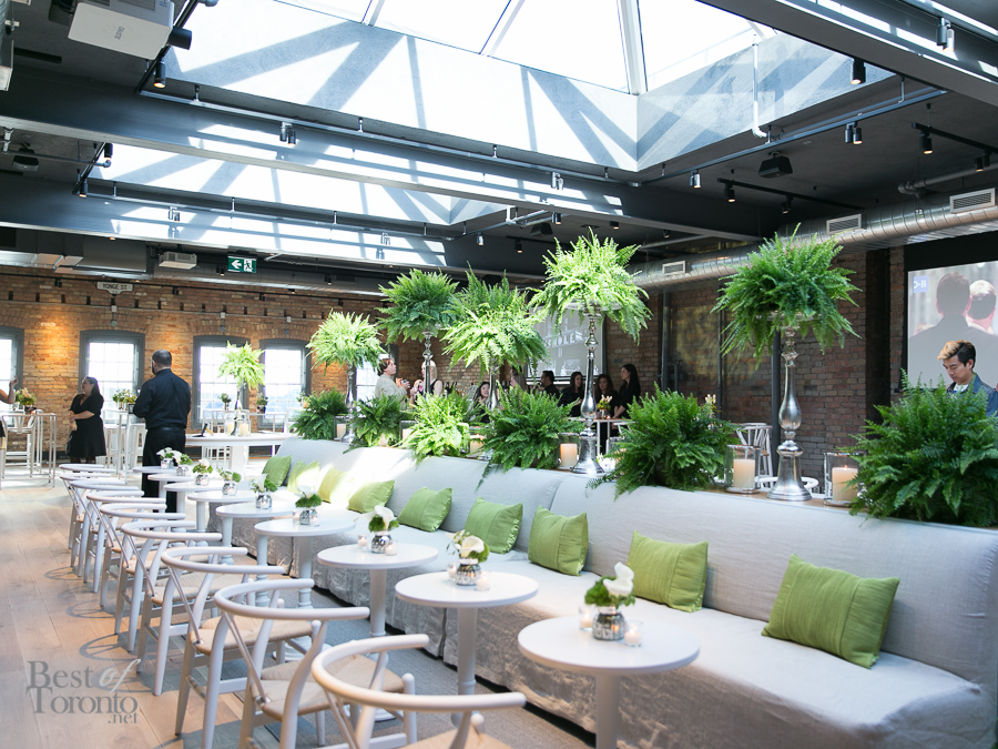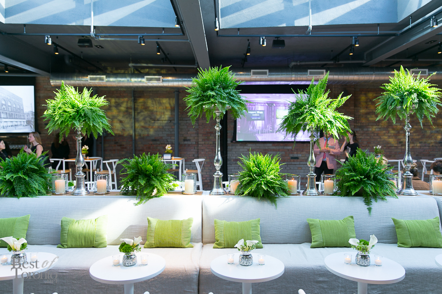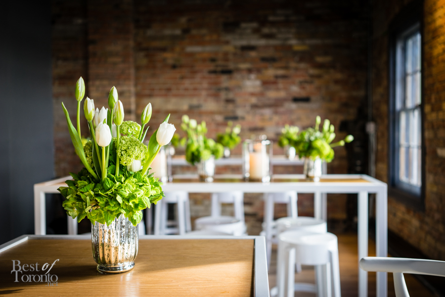 Upon entering, you’ll be immediately surprised by how bright and open the space is, thanks mostly to the three large sky lights above. On this day, the decor had a garden theme with its white furniture and green plants, giving that outdoor courtyard feel, but indoors. Other features of the space include restored hardwood floors, exposed brick walls, a custom-designed bar, and a very cool chalkboard graffiti wall. There is also built-in AV equipment including state-of-the-art screens, projectors and lighting, ready for use for your event.