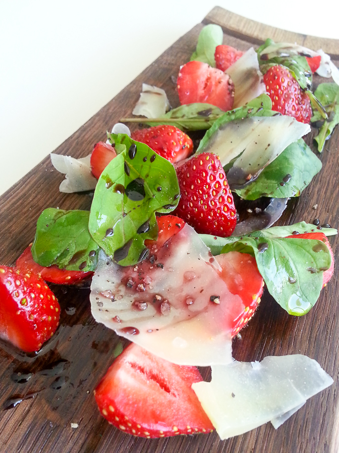 Strawberry salad with fresh Ontario strawberries, baby arugula, petit verdot vinegar reduction, shards of shaved handeck