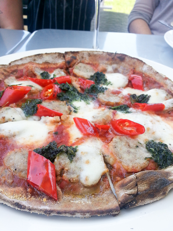 When you’re at Southbrook Vineyard, you’ll marvel at the modern aesthetic of the Leed -Gold certified building for environmental sustainability designed by Diamond and Schmitt Architects. Additional bragging rights include the winery being the first in Canada to earn both organic and biodynamic certifications for its vineyard and winery. And it’s still an ongoing project for Bill Redelmeier, owner of Southbrook, with his wife Marilyn. Bill doesn’t like waste– so how does it translate into the food and wine? Well, something pretty unique, that’s what. With Chef Shawn Murphy at the helm of the kitchen, guests will delight in the fresh oven baked pizzas he makes in the summer on the patio. The dough is made with Red Fife, a grandfather grain from the prairie provinces. It’s hearty, wheat flavour is intensified with Bioflavia powder. Rich in antioxidants, it is organic red wine grape skin powder that Southbrook winery produces. Chef Shawn has perfected the ratios so that the dough now produces its own yeast and leavening power. The earthy undertones the grape skin lends to the crust is unmatched– even more fun when sipped with their smooth 2013 Organic Cabernet Franc. As much as possible, Chef Shawn sources locally. With their own herd of sheep(!) helping to reduce the weeds in the vineyard and providing a source of meat, Chef makes a pizza pie dotted with juicy lamb sausage, feisty sweet and sour hot peppers, wild garlic mustard pesto and gooey buffalo mozzarella. Yearning for something a tad lighter? Try the simple but sumptuous strawberry salad. Fresh Ontario gems from Quiet Acre Farms and baby arugula are sprinkled with salt and pepper, then drizzled with sweet and tangy reduction using petit verdot vinegar, and shards of shaved Gunn’s Hill handeck.