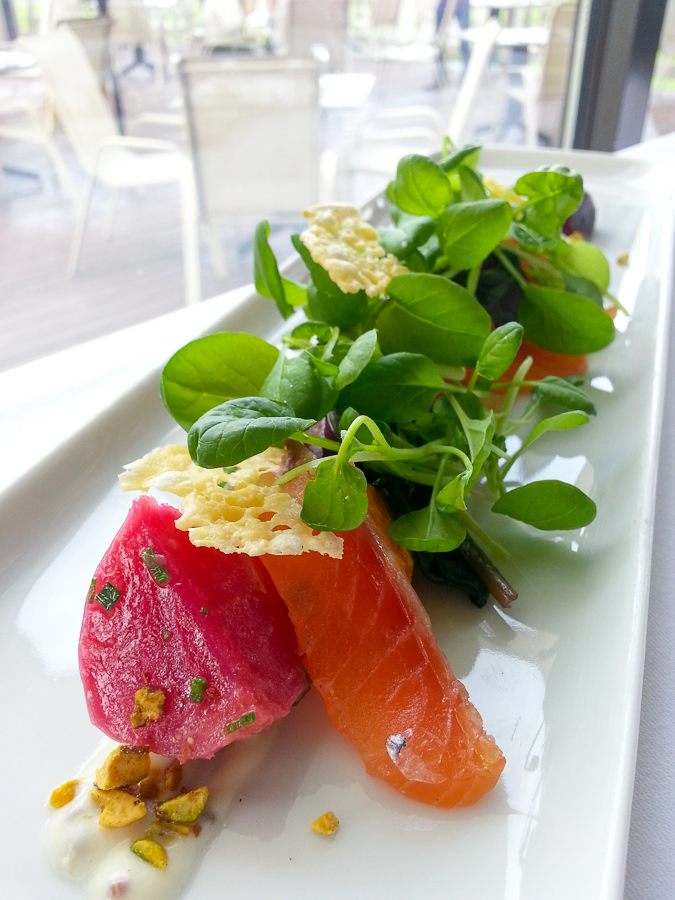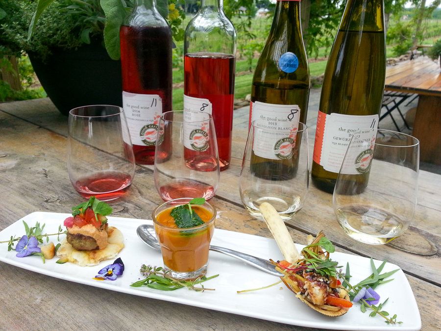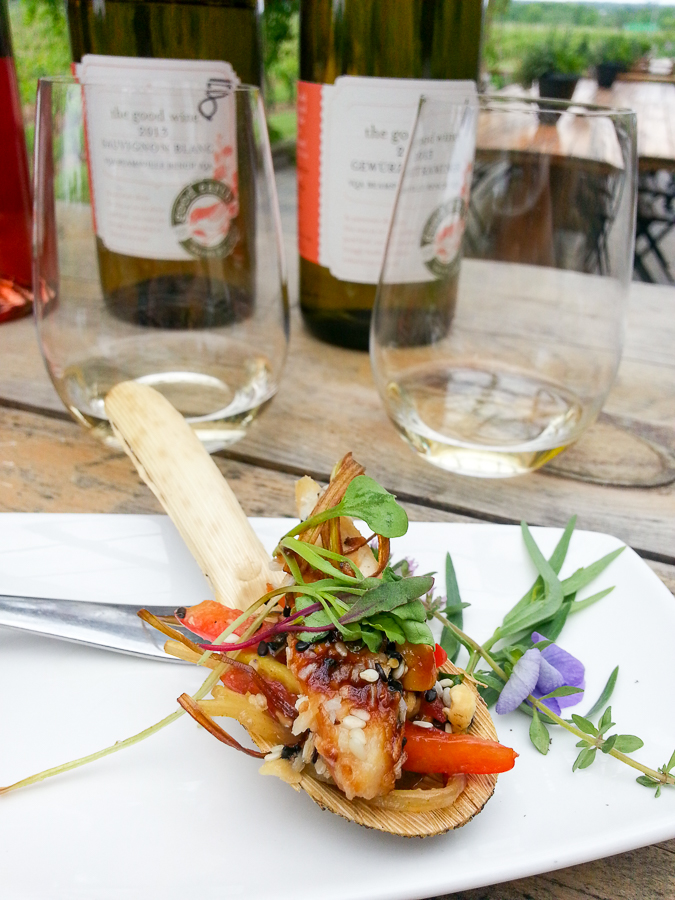 Over at Ravine Vineyards, Chef Ross Midgley and Winemaker Martin Werner make magic with Chef’s charcuterie board and Martin’s pairing of it with a 2014 Cabernet Rose. The low sugar and higher acidity in the wine is the perfect counterpoint to the rich, housemade charcuterie board. In raising their own pigs, sourcing ingredients from their backyard or from their neighbours down the road (aka no carbon footprint!), Ravine is a champion of the farm to table philosophy. Everything is ethically sourced. And as chef says, “It tastes better too”. And boy does it ever. Eat the creamy mortadela studded with nutty pistachios. Revel in the lush and decadent pancetta, then take a sip of the rose. Wild ramps and pickled vegetables cleanse and awaken your palate. Dive into that chicken pate with its mousse-y texture that is perfect for spreading on crisp crostini. With stunning view of the vineyard, you’ll want to come here and linger for hours with good wine and fantastic seasonal plates.