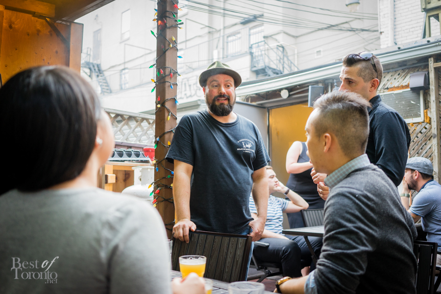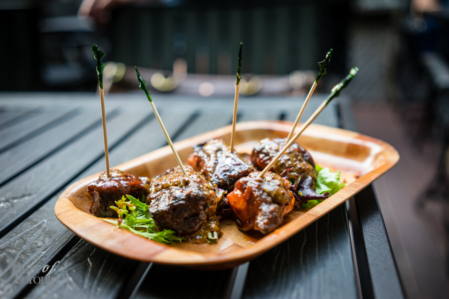 Being able to check out the back patio was a nice surprise; I try to frequent as many patios as I can during the summer months. Greenwood Smokehouse’s patio felt like a friend’s backyard – a place where you feel welcome and want to stay awhile. There owner and pitmaster, Warren DeSimone, showed off the large wood burning oven where the meats are smoked. We enjoyed our first bite of the evening – the deliciously tender and saucy Memphis rib tips, along with a glass of watermelon beer and shot of bourbon. Having whet our appetites, we then headed back inside, now eagerly anticipating the mains to come.