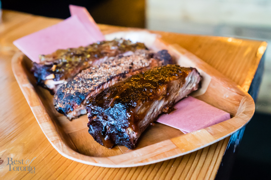 The Cobbler Salad came first. I liked this take on the Cobb salad, not only because it had smoked turkey and bacon, but also avocado and blue cheese. Next, we sampled ribs done three ways – with a Carolina sauce, a Memphis sauce, and a dry rub. Each of them was fall-off-the-bone tender, and very flavourful. Then came the pièce-de-resistance – a platter consisting of brisket, pulled pork, and smoked wings. We were in barbecue heaven – all of it was delicious, with the brisket being my personal favourite. Accompanying the meats were double-smoked beans, a coleslaw, and a three cheese cream mac ‘n cheese topped with asiago that was brûléed. The sides complemented the meats very nicely.
