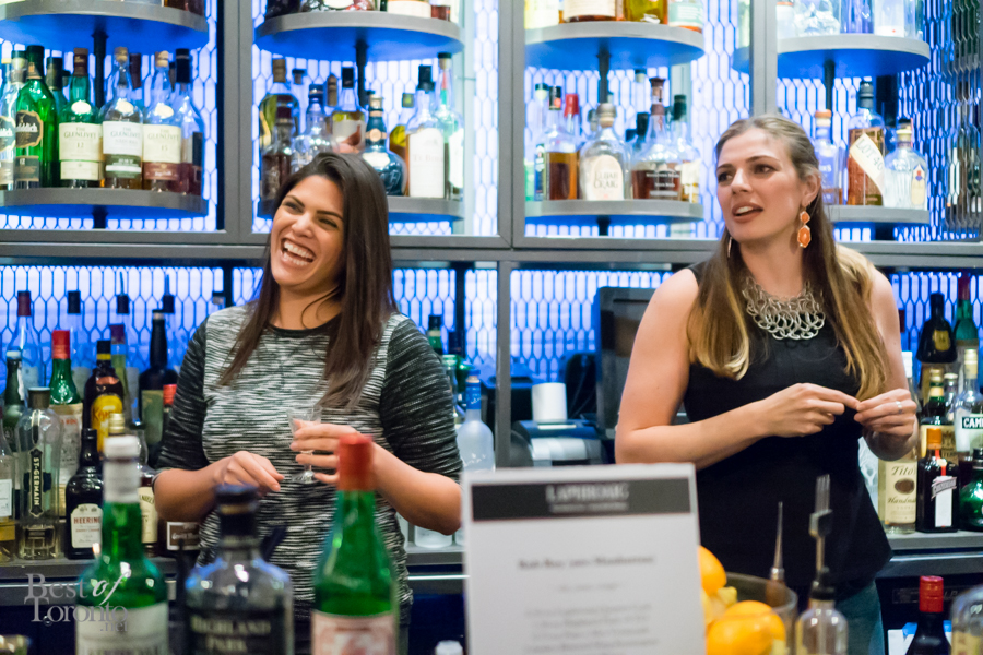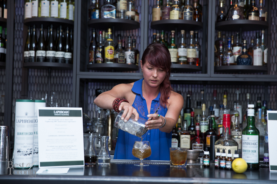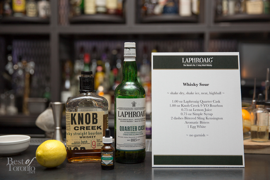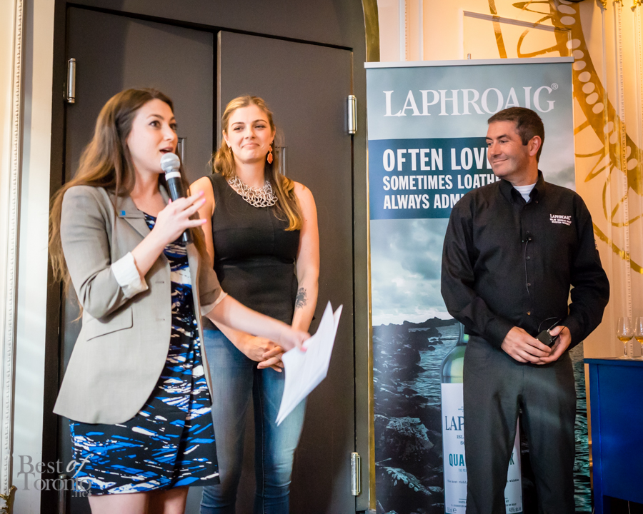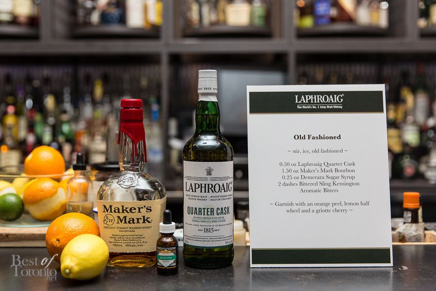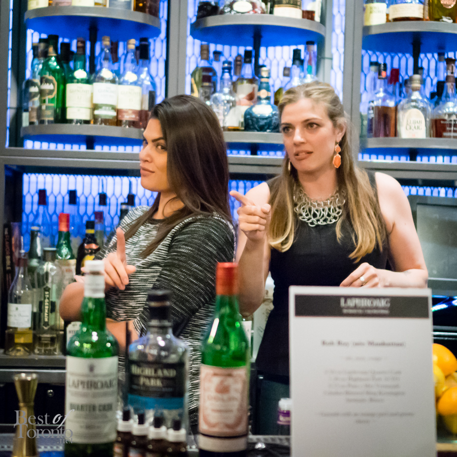 After a short break, we then headed to the bar area where we got a mixology lesson from three Vancouver bartenders, Lauren Mote, Danielle Tatarin, and Christina Kuypers. Mote is co-proprietor of Bittered Sling Bitters, and bar manager at UVA Wine & Cocktail Bar. Each of them demonstrated in turn how to make three classic cocktails made using the Laphroaig scotch whiskies – the Whisky Sour, the Old Fashioned, and the Rob Roy (aka Manhattan). We’ve provided the recipes below, so be sure to bookmark this page. The three women were beautiful and charming; engaging and capturing the attention of the crowd. One memorable quote from the night came from Tatarin. When asked her opinion of Laphroaig, she said, “Laphroaig is the only marriage I’m willing to commit to!”