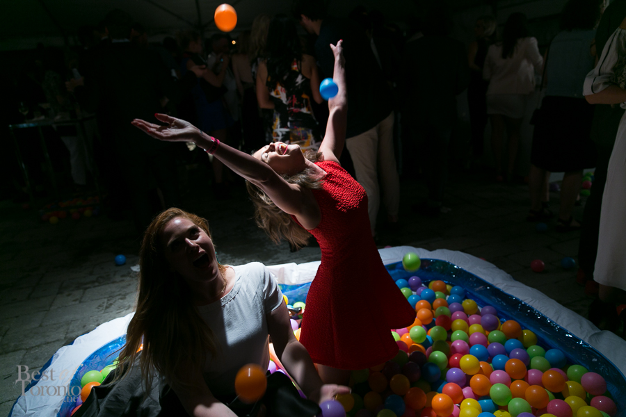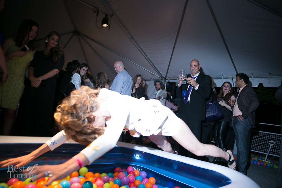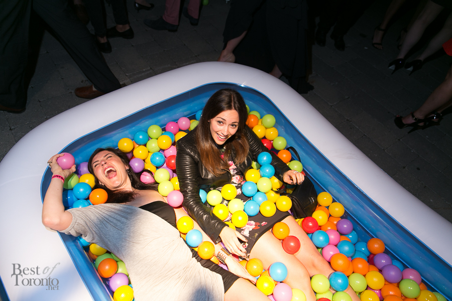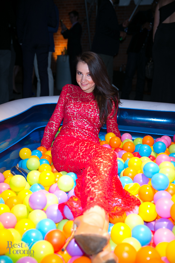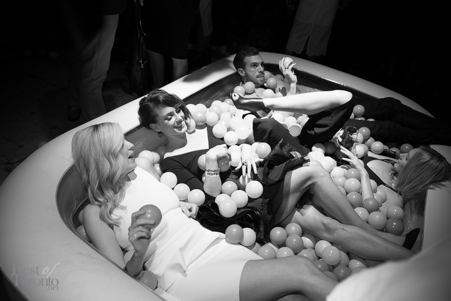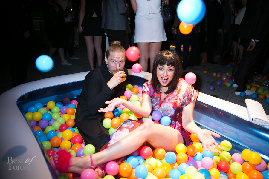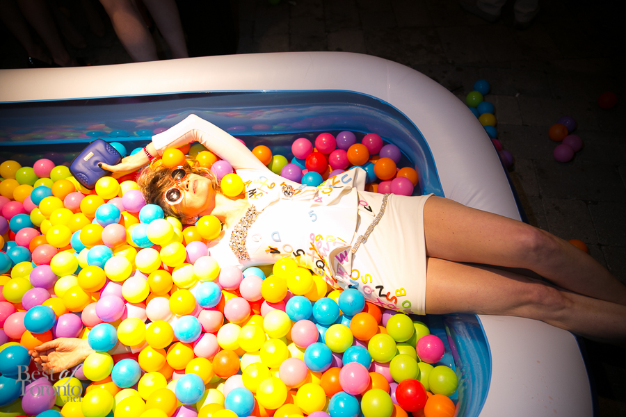 There was the “fire” room with its floor to ceiling projections of fire, stretch limousine and red police strobe lights while another gallery housed giant hanging bodysuits. Other standout installations included Orest Tataryn’s neon light and chiffon wall-hanging, a mirrored corridor perfect for selfies and snapchats, a disco ball room for 8 (with it’s own bouncer and velvet roped queue) and Flare magazine’s kiddie pools filled with plastic balls.