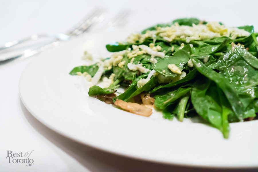 Next on the bill of fare were the caesar and spinach salads. For the caesar, you could smell the fresh citrus permeating the air, and added to it–the sharp anchovies, garlic, Worcestershire sauce, and egg yolks. After a bout of vigorous whisking, it was poured over salad greens and croutons. The warm spinach salad included a tableside sauteed with caramelized onions, mushroom, bacon and brandy then set ablaze to let the flavours meld. The sauce was poured over the greens and finished with a sprinkling of hard-cooked egg tidbits. Both well executed, but I definitely favoured the caesar over the warm salad. There’s an addictive quality to that tangy, creamy sauce and the texture of those crunchy croutons that keeps you coming back for another bite.