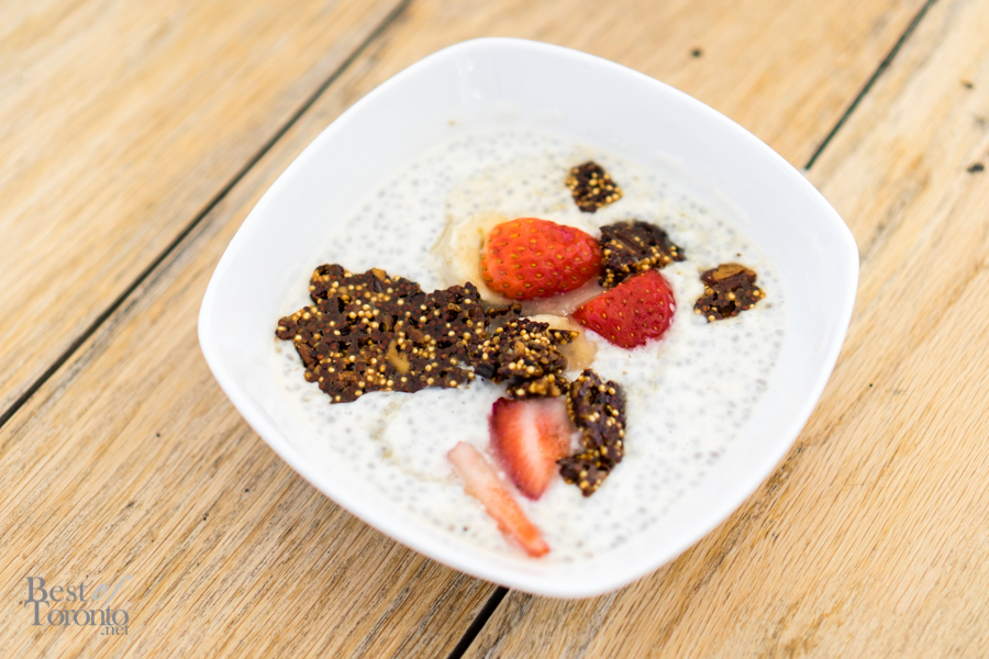- Chia seed and almond milk pudding, with strawberries, banana, maple, quinoa brittle