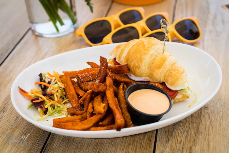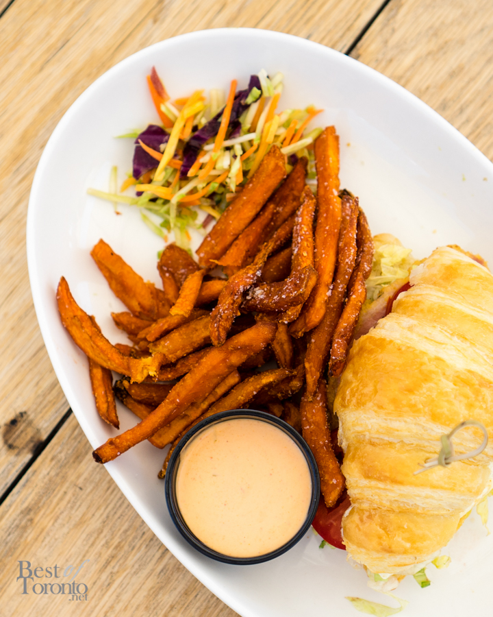 - Peameal bacon and fried egg sandwich with O&B artisan butter croissant, lettuce, tomato, avocado mayo, sweet potato fries