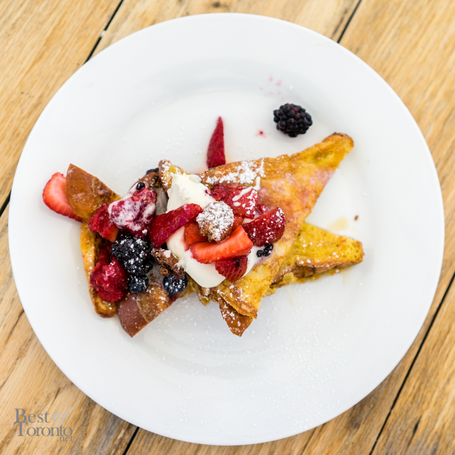 - Left: Peameal bacon and fried egg sandwich with O&B artisan butter croissant, lettuce, tomato, avocado mayo, sweet potato fries Right: Cinnamon brioche french toast with seasonal fruit, chantilly, candied pecans, local syrup