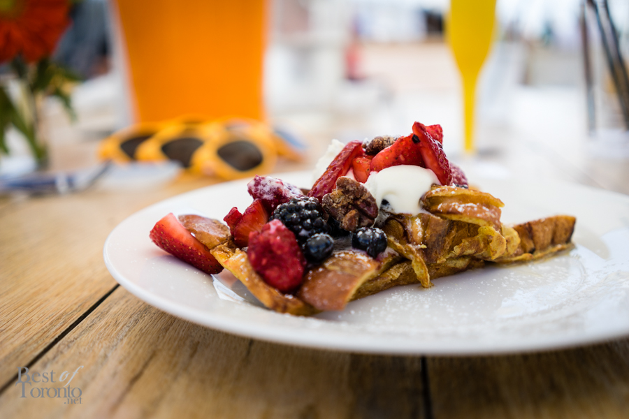 For the mains you had four options. Our choices from the four were the peameal bacon and fried egg sandwich and the cinnamon brioche french toast. The sandwich came with a side of sweet potato fries, and the french toast had fruits, chantilly, candied pecans and syrup. Of the two, my choice would be the cinnamon brioche french toast. I liked the balance between the tartness of the fruit and the sweetness of the cinnamon brioche and syrup. The two remaining options for mains were the smoked salmon, egg and spinach pizza, and the grilled chicken caesar.