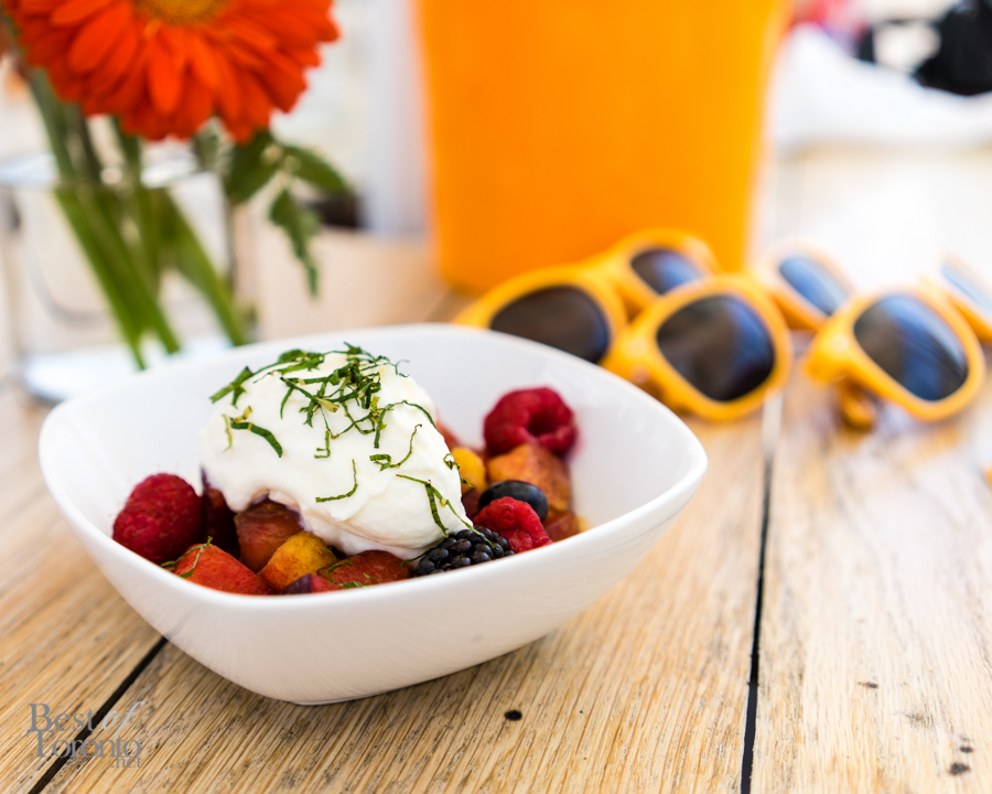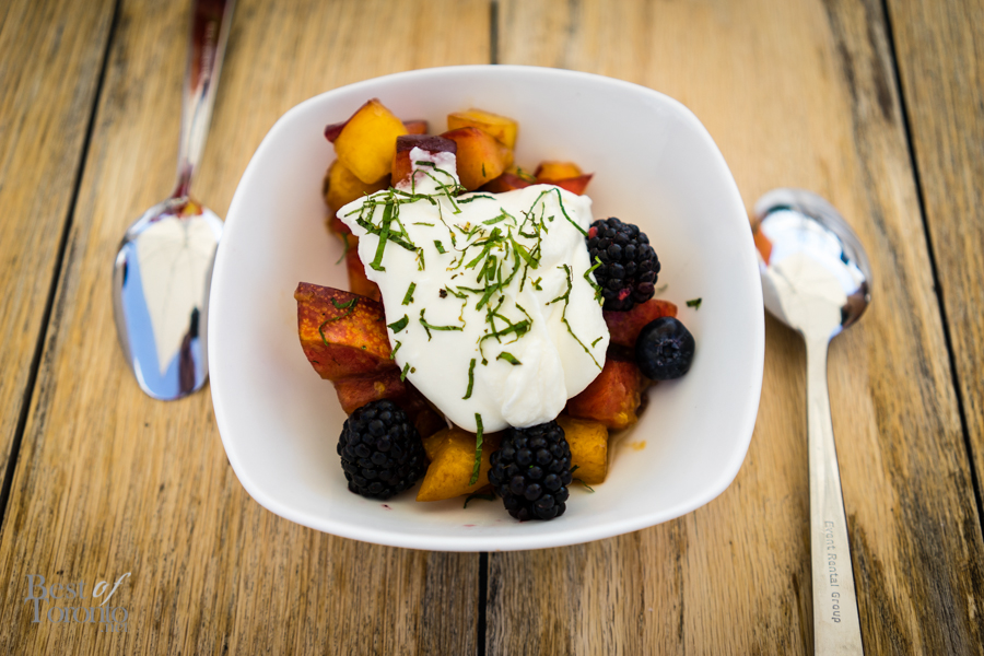 Finally, for dessert we finished on the light and healthier side with a bowl of macerated summer stone fruit and berries. The fruits and berries were quite fresh and delicious. The only thing I would change is the mint, which didn’t quite harmonize with the rest of the dessert.