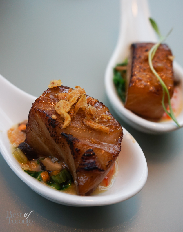 To combat the issue of potentially muted taste buds at 35,000 ft, food is given a mélange of textures and tastes. Appetizers such as crispy puffed rice sprinkled on top of creamy Yellowfin Tuna Tataki is a prime example. Scallion ginger vinaigrette lends the perfect amount of acidity. Also glorious is the Smoked Ontario Duck Breast– it is unctuously soft on the tongue. It sits a top of a lacy wafer and invigorated with refreshing Waldorf salad and mustard apple puree. For mains, Tamari Roasted Sablefish makes eyes roll back with pleasure. The sweet fish is an umami wonderland; it hits all the happy zones on the palate. For dessert, a creamy dark chocolate fondant whispers with hazelnuts. Tart blackberry compote provides a tangy refresher from the richness.