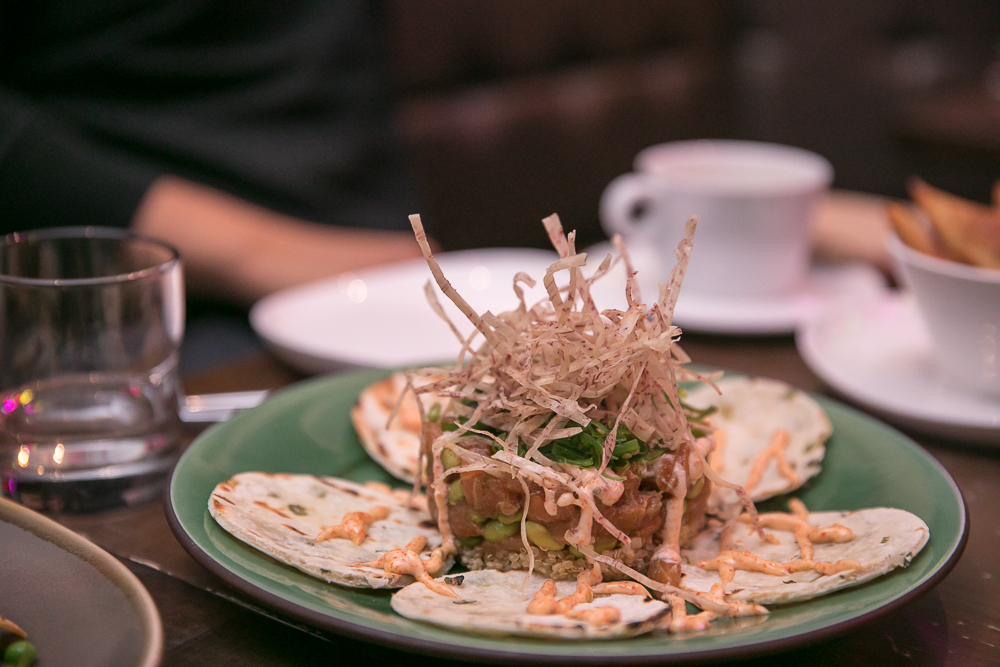The braised “Red Stripe” Slow Cooked Oxtail is arranged neatly under crisp plantains and heirloom carrots. This dish encompasses fall with its warm tones and hearty flavours. Freshness in the “Poke” is found in the organic salmon. One can make their own scallion flatbread taco using the stacked ingredients; an array of soft and crisp textures including wakame, edamame, and fried taro; complete with a flavourful togarashi mayo.