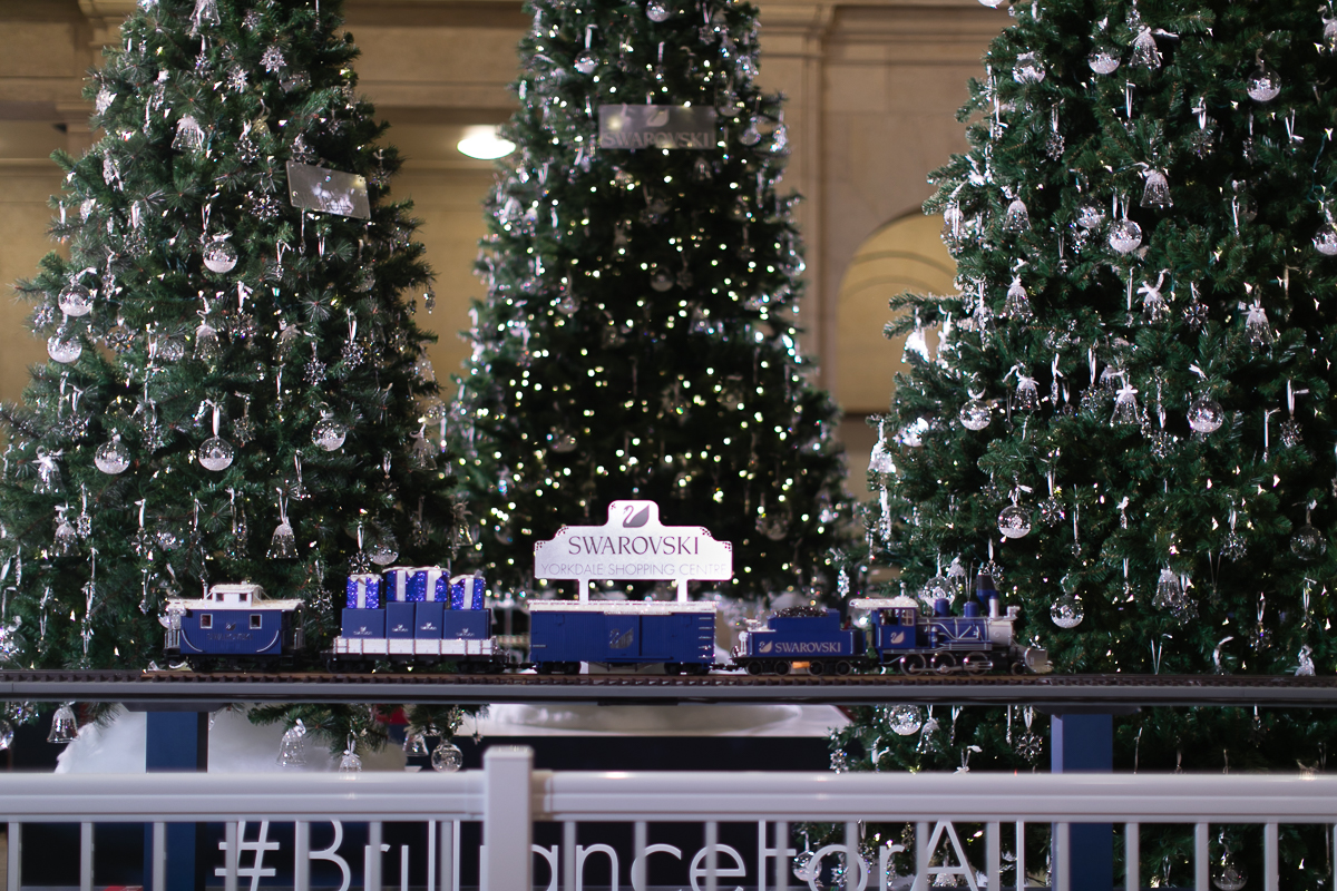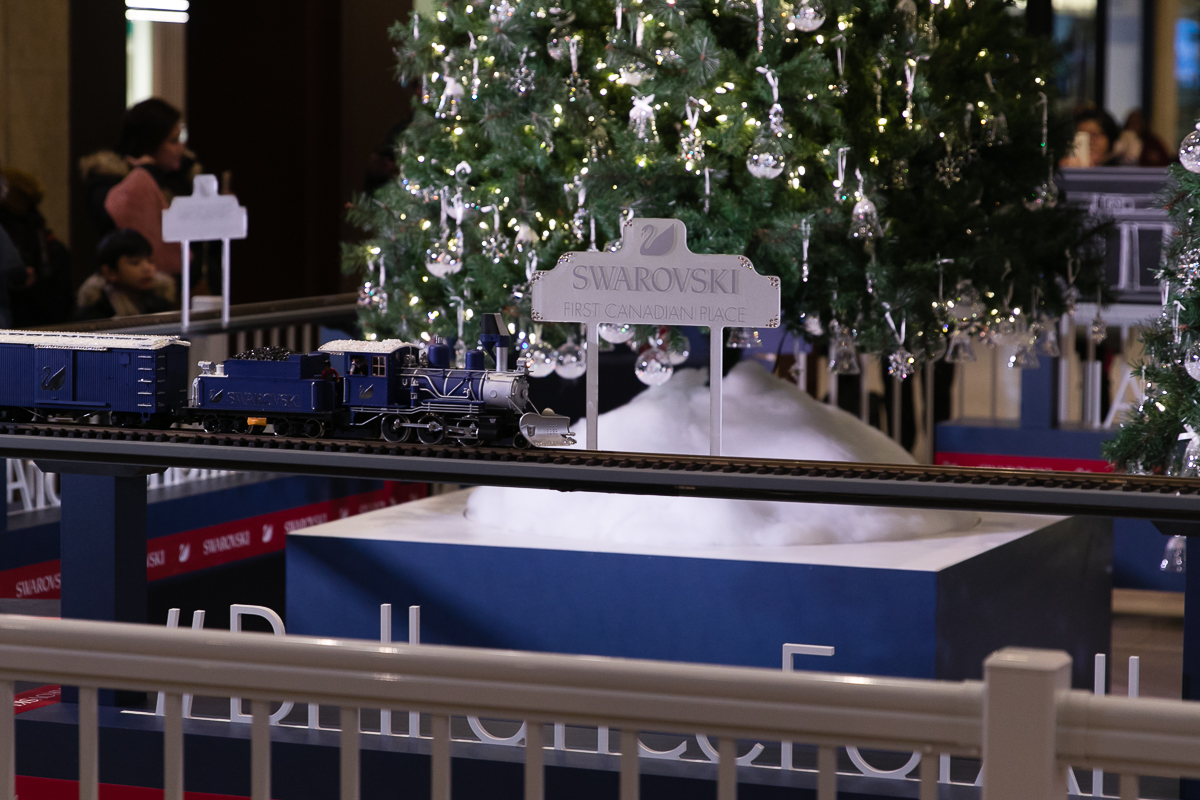 Completing the trees (and the photo op) are mini train tracks surrounding them, and a Swarovski- crystallized train that circles them. There are four stops that represent each of the four sites where Swarovski trees are found: Union Station, Yorkdale, Eaton Centre, and First Canadian Place.