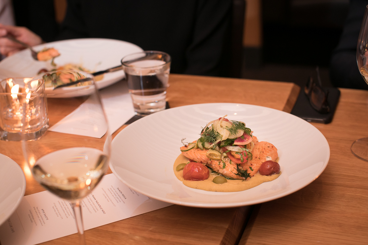 - Mediterranean-inspired Salmon Fresca with fresh herbs, baby gem tomatoes, shaved fennel and hummus
