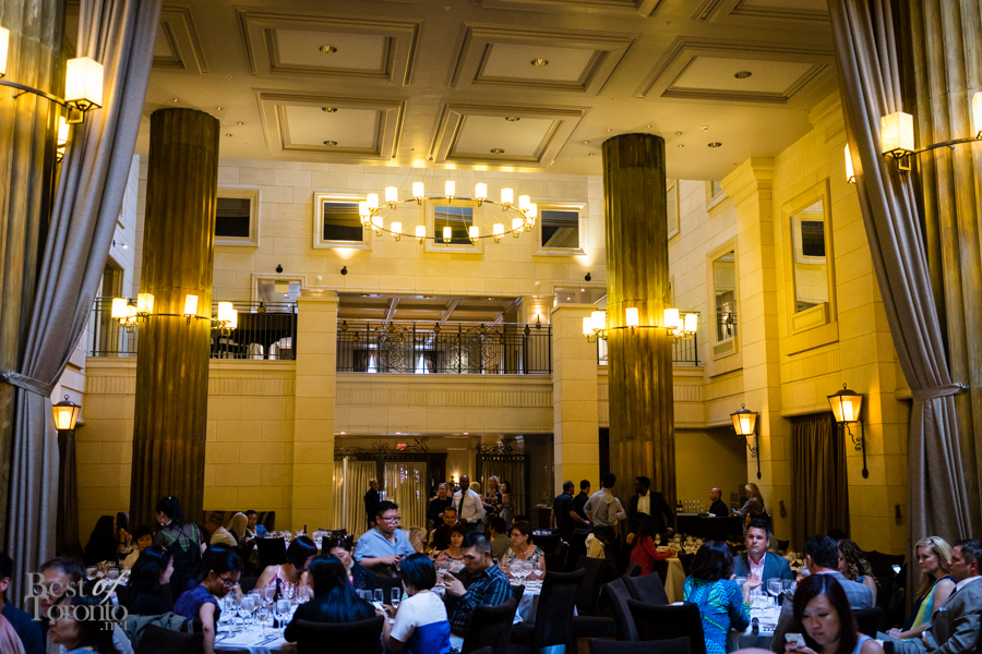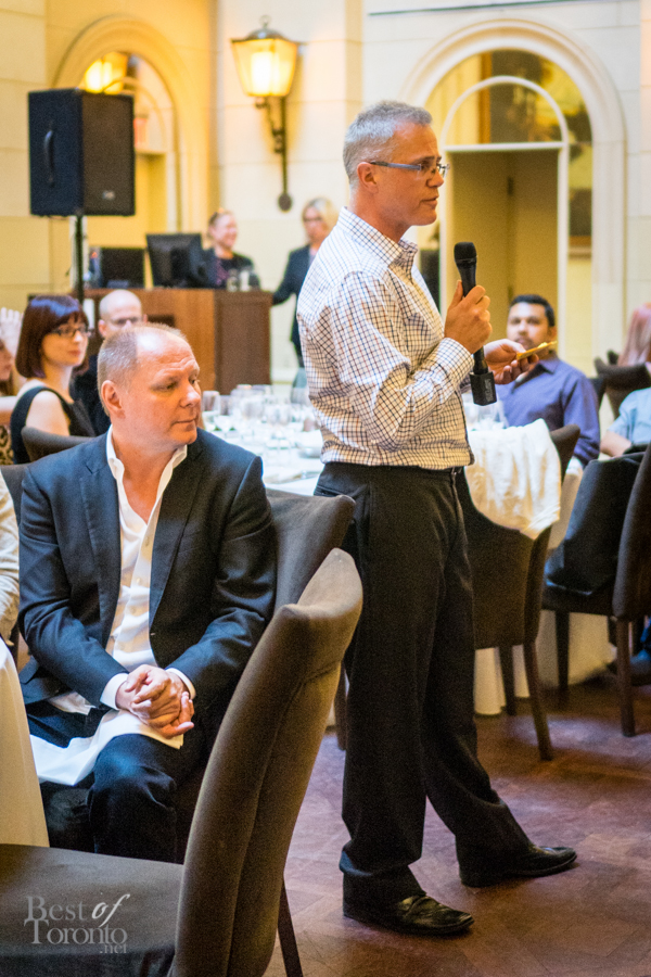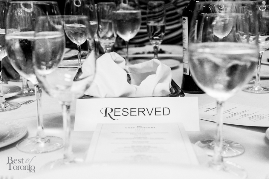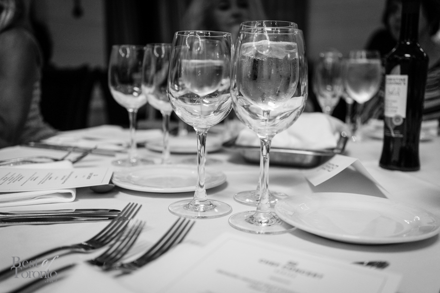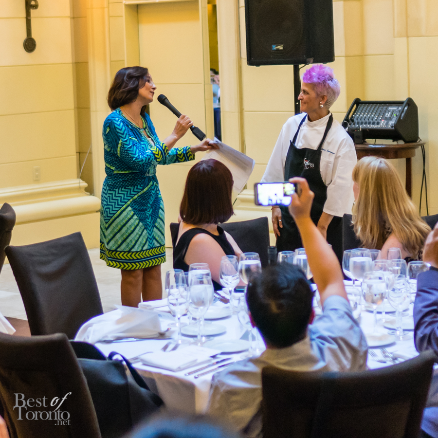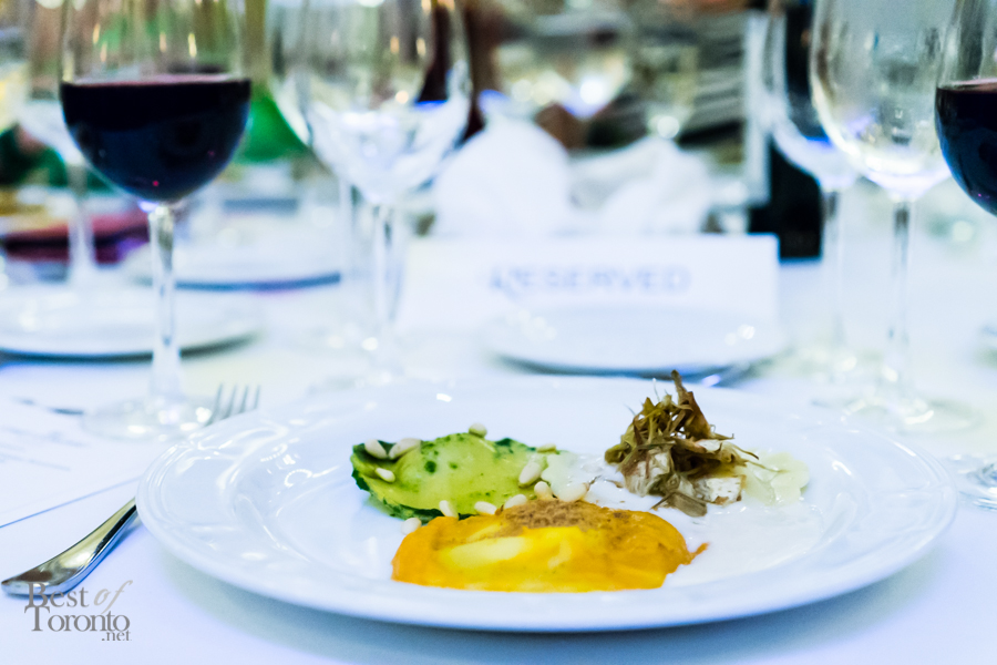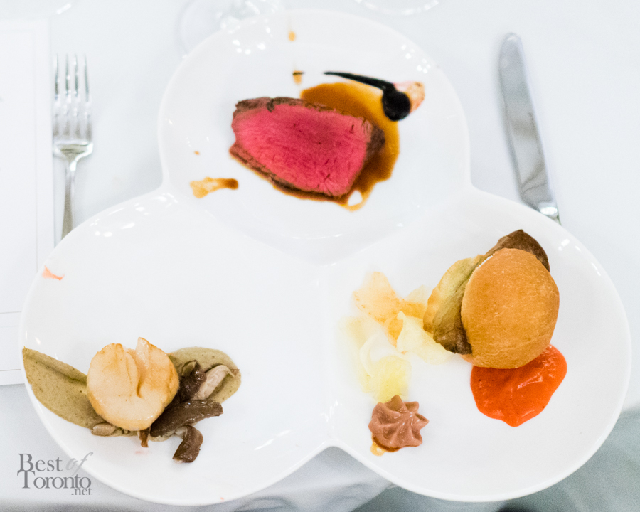 We walked into the beautifully appointed grand ballroom of the Windsor Arms Hotel where the dinner would be held. The table setting was elegant and every seat was sold. The second floor provided some stunning views of the dinner below. After some brief words from Cushing and U-Feast CEO Terry Mocherniak, our “threes” themed dinner began.
