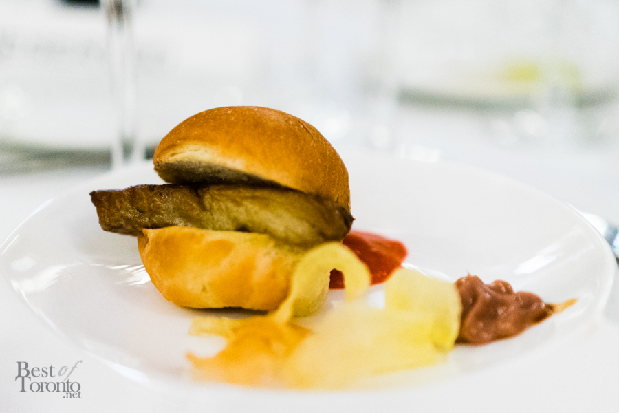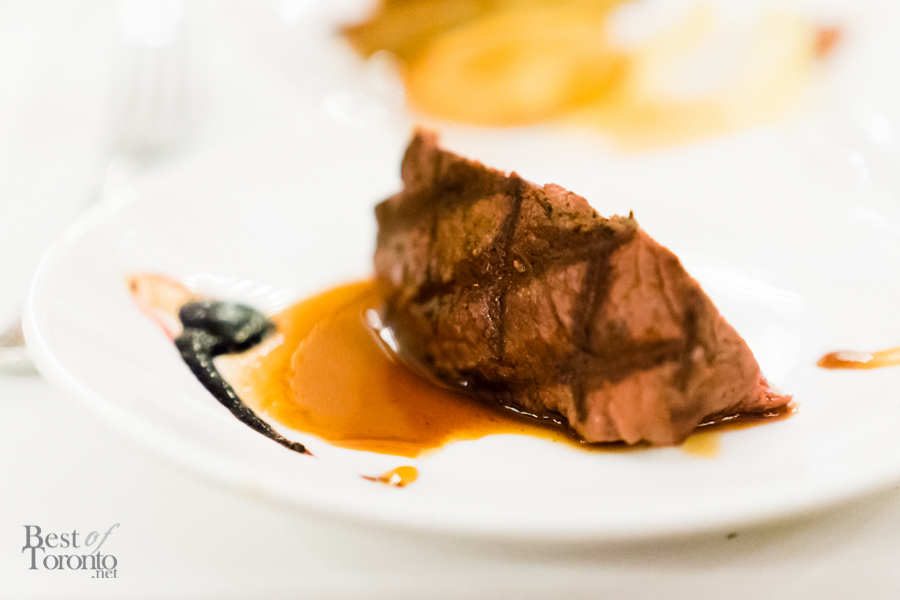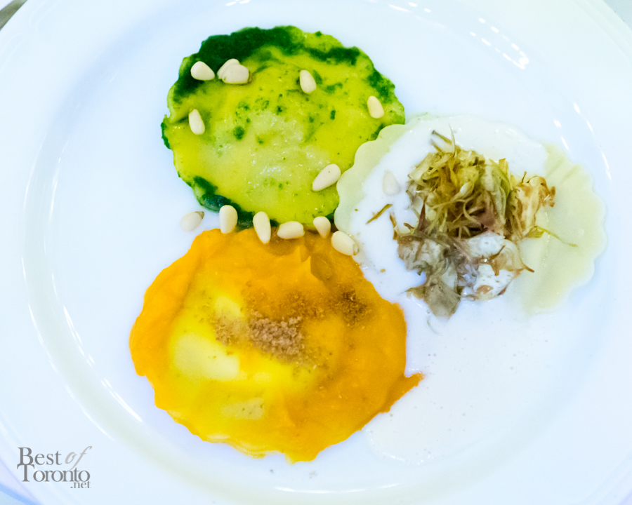 First up was the “temptation” appetizer course – a Sangria-cured beef filet with a trio of rouge. The three reds were a roasted beet purée, a cherry salad, and compressed watermelon. The watermelon was a nice refreshing component, but my favourite would have to be the beet purée for its bold flavour. Next was the “encounter” course – a trio of ravioli. While the salt cod and artichoke was an unexpected and unique combination for a ravioli, my preference was the ricotta and butternut squash. The third ravioli consisted of shrimp and pesto.