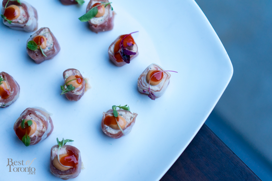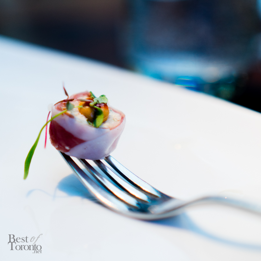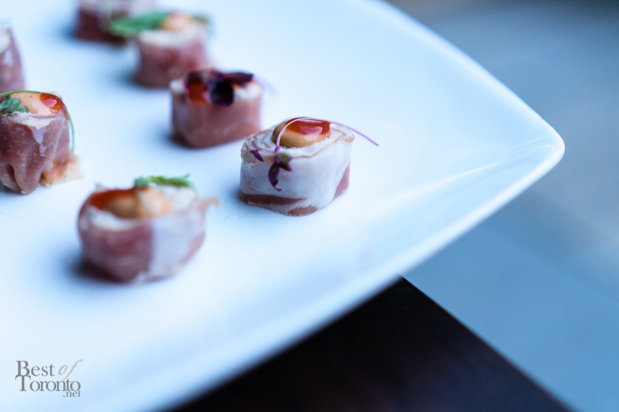 Dinner then began with several appetizers. The lobster bisque was creamy with the porcini mushroom flavour coming through nicely. The crispy Eryngii mushrooms with emerald kalettes (featured image) were delicious – the crispness of the kalettes juxtaposed with the juiciness of the mushrooms created a perfect pairing. The proscuitto di parma lobster boursin roulades were delicate and beautifully put together. There was even caviar served.