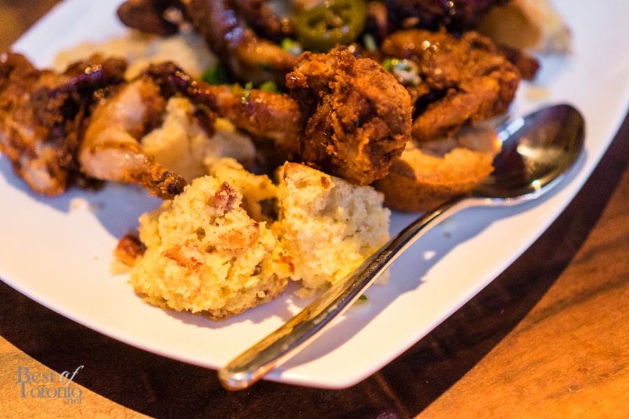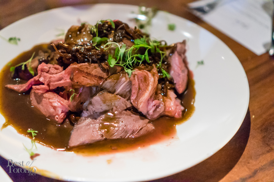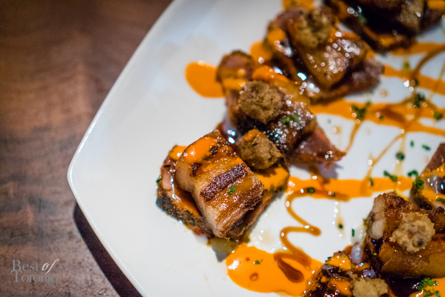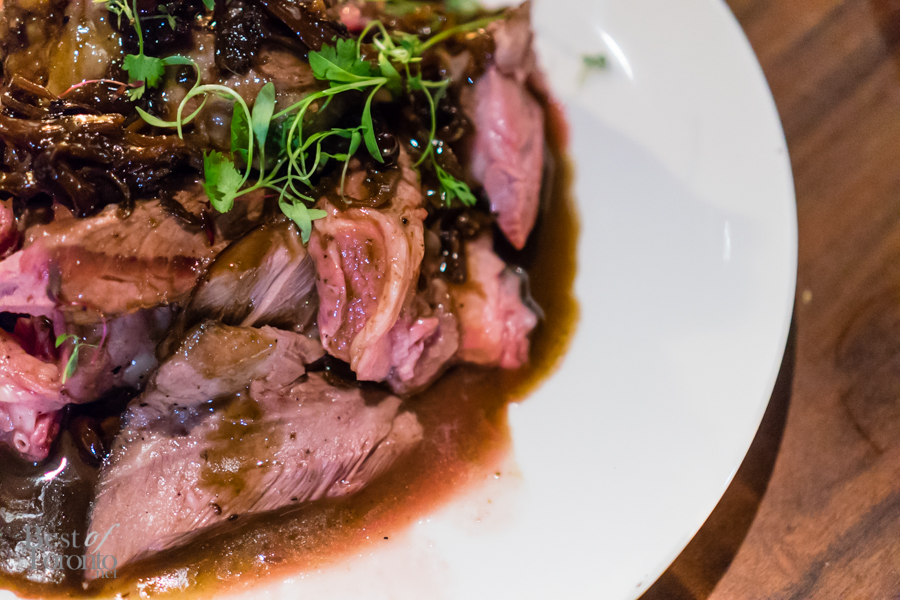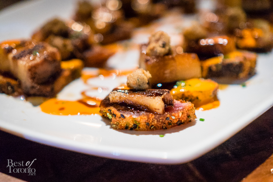 With the appetizers finished, it was time to move on to the mains. Fried chicken? Check (well quail actually). Pork belly? Check. Lamb? Check. It was like the chefs knew all of my favourite foods. Not only that, the chicken fried quail came with bacon corn bread. The pork belly was on a bed of seared Fijian yellowfin tuna, and then topped with black garlic tempura, smokey piquillo droplets and a sweet glaze. This was a surf and turf at its finest.