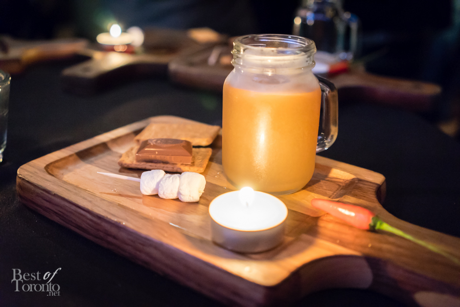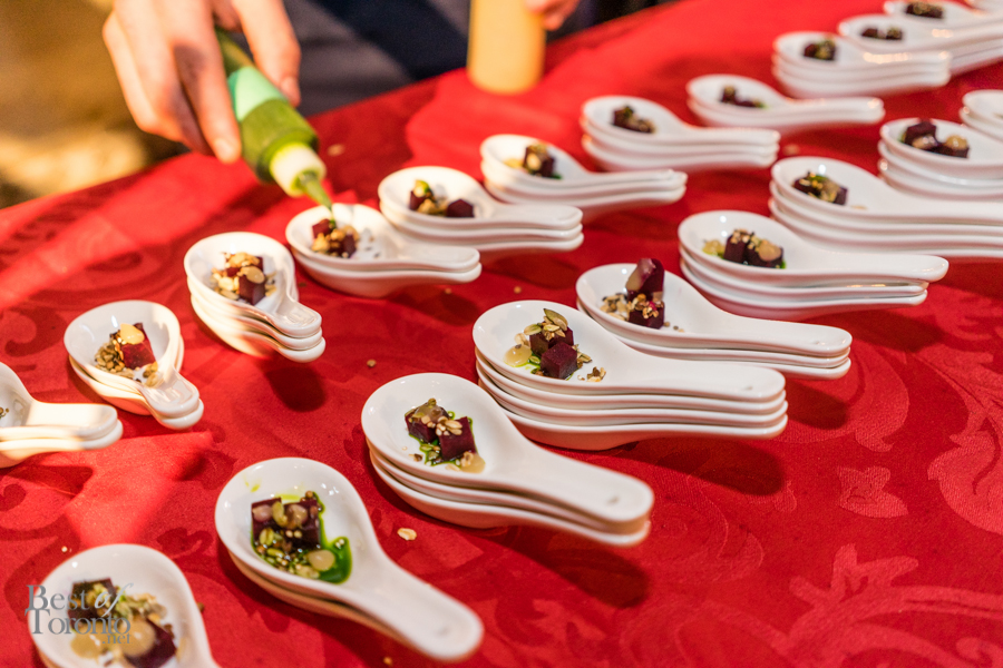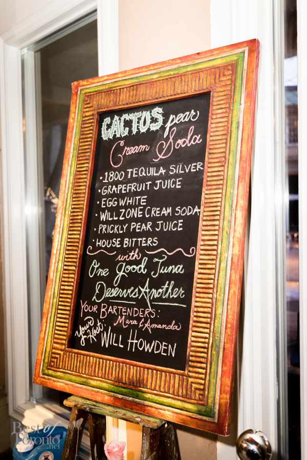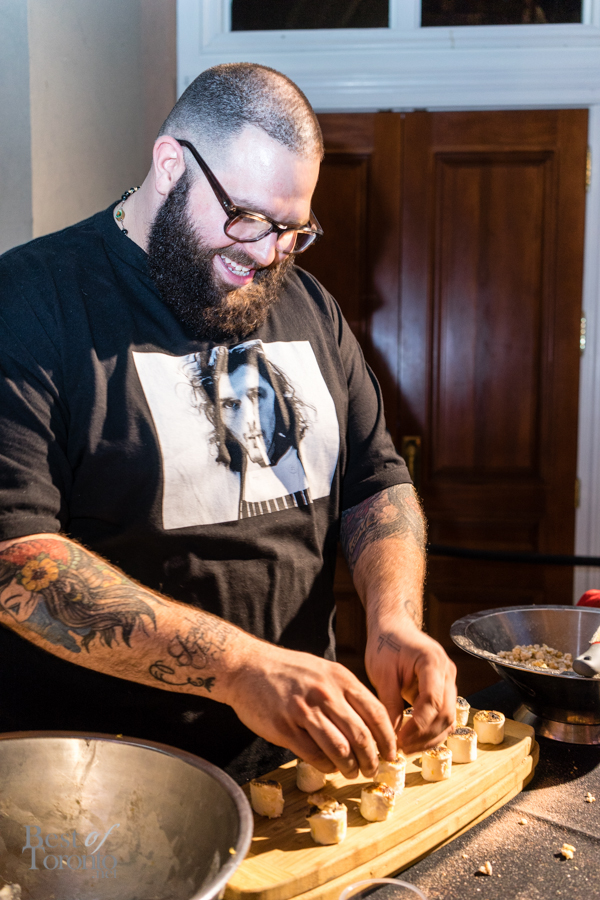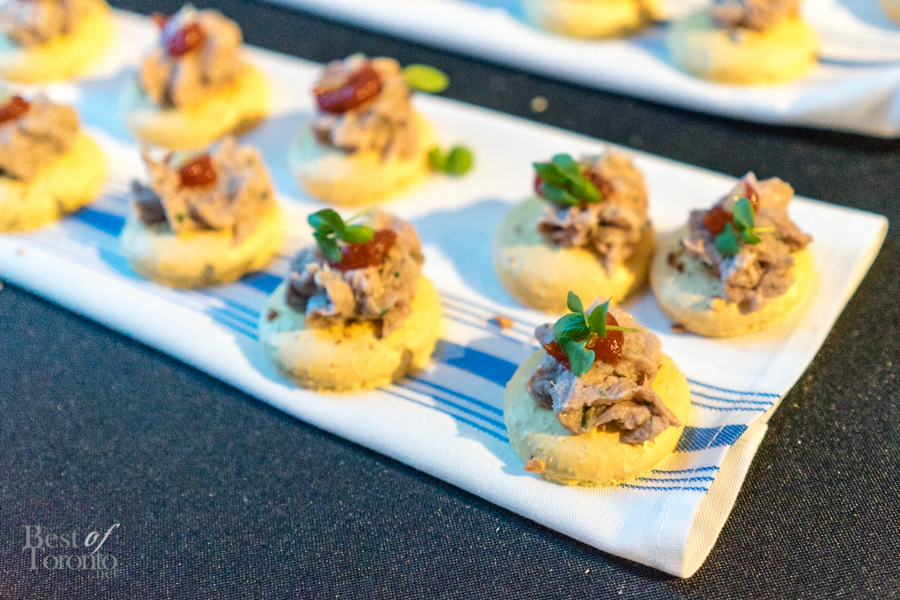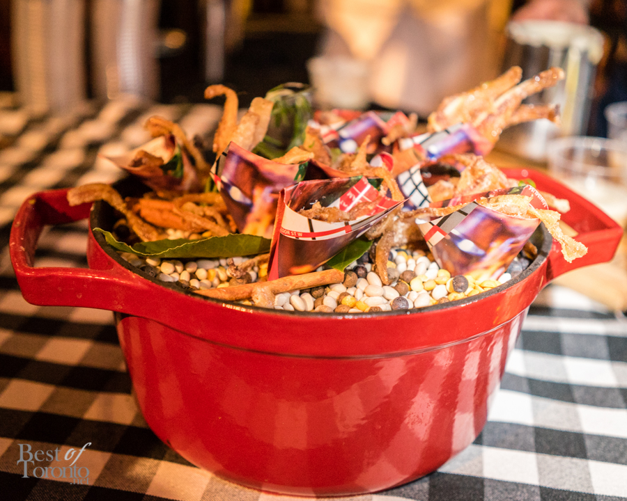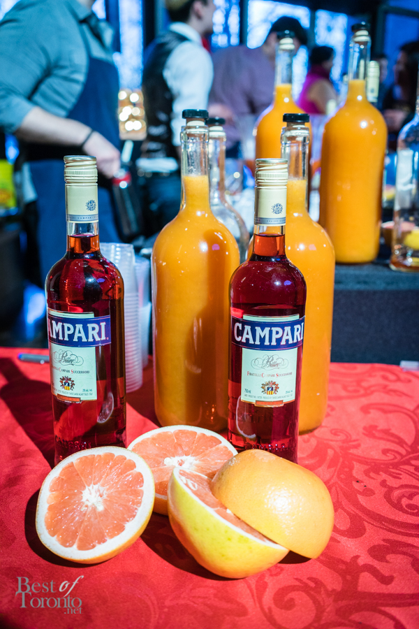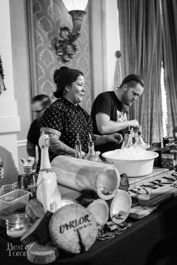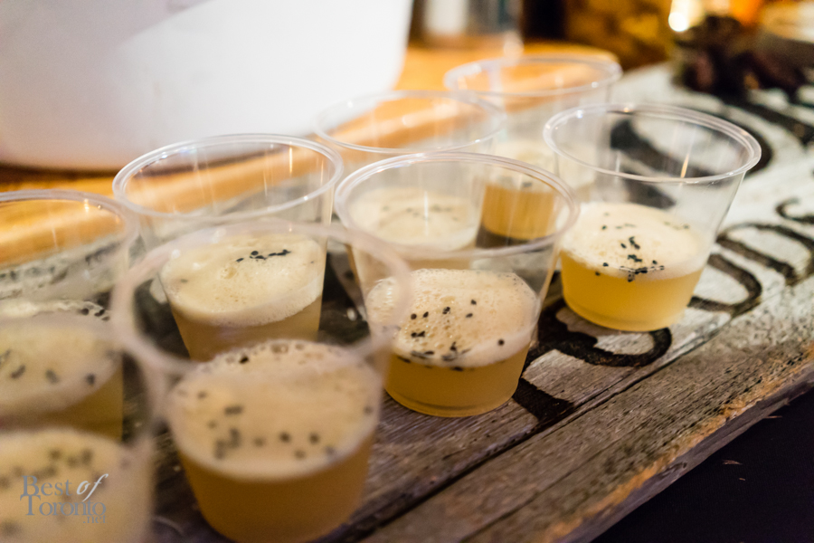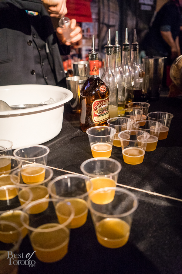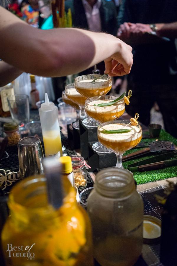 With over twenty bartenders participating, there was a plethora of unique cocktail choices. My own favourites were Mike Crispo‘s (Soho House) Crisp “Hard Italian Soda”, consisting of Campari, carbonated water, blood orange juice, rosemary, acid phosphate, and sea salt. This mix of blood orange, rosemary, and salt tickled the sweet, bitter, and salty taste buds at the same time. I also enjoyed drinking the cocktail from a bottle, which was sealed, cooled, and then unsealed when it was ready for serving. Another personal favourite was Andrew Hunter‘s Butterface, which paired perfectly with The County General‘s crispy pigs ears from Chef Adam Alguire.