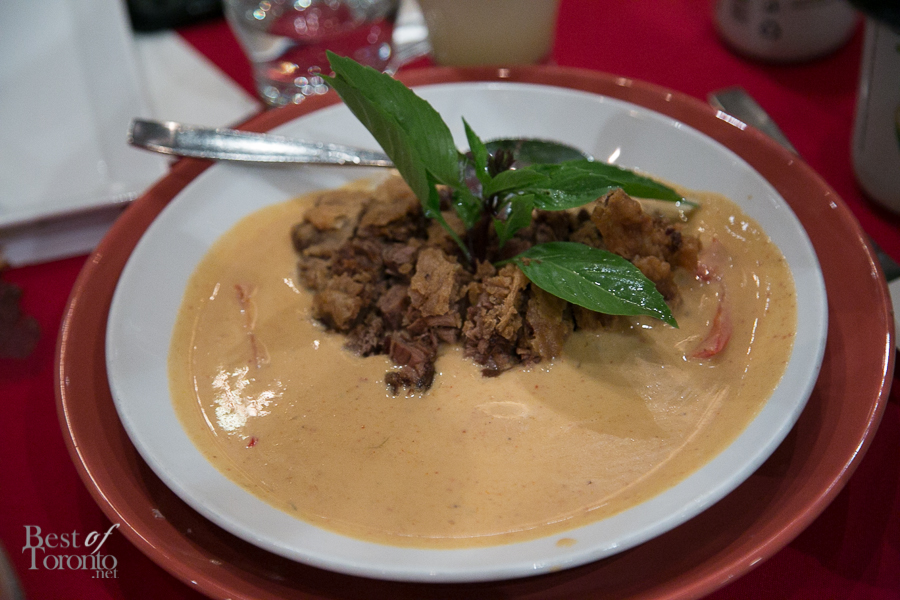 Some of the highlights included a lush, buttery Thai Lobster bisque with chubby nuggets of lobster bobbing within the golden brown broth. We also got to revel in textures with the Crispy Beef Panang: morsels of meat nestled together to form a crescent moon in a rich, golden-hued curry made with floral coconut milk and crunchy peanuts. The other darling of the evening was the Stewed Duck with Chestnuts. It arrived on our table glistening and blushing in rouge with the skin draped over the pull-apart meat. A reduction sauce of red and rice wines was ladled over the duck; the flesh was rendered a melt in your mouth softness. The dish was lined with hearty chestnuts and evoked memories of family meals one would have during the holidays.
